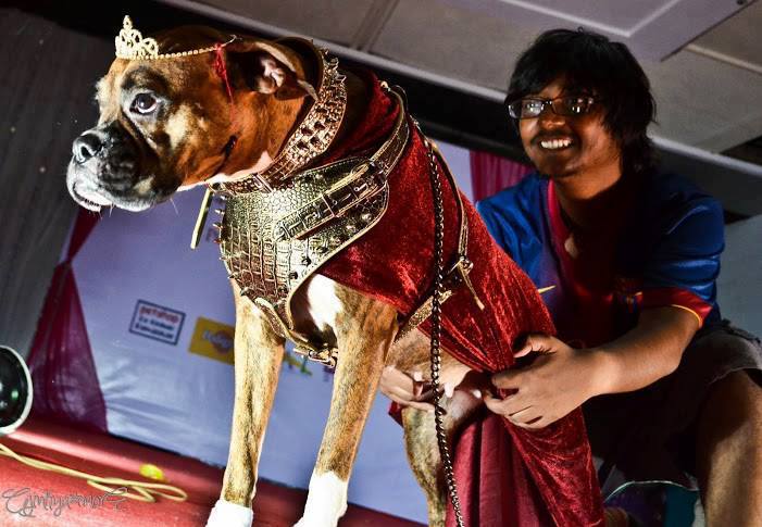 Hachi dressed as a warrior princess in a fashion show for dogs, held in Mumbai, India.
